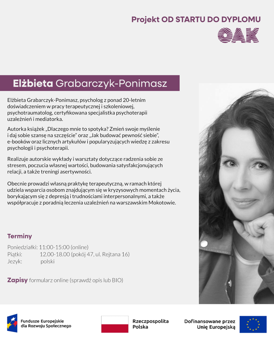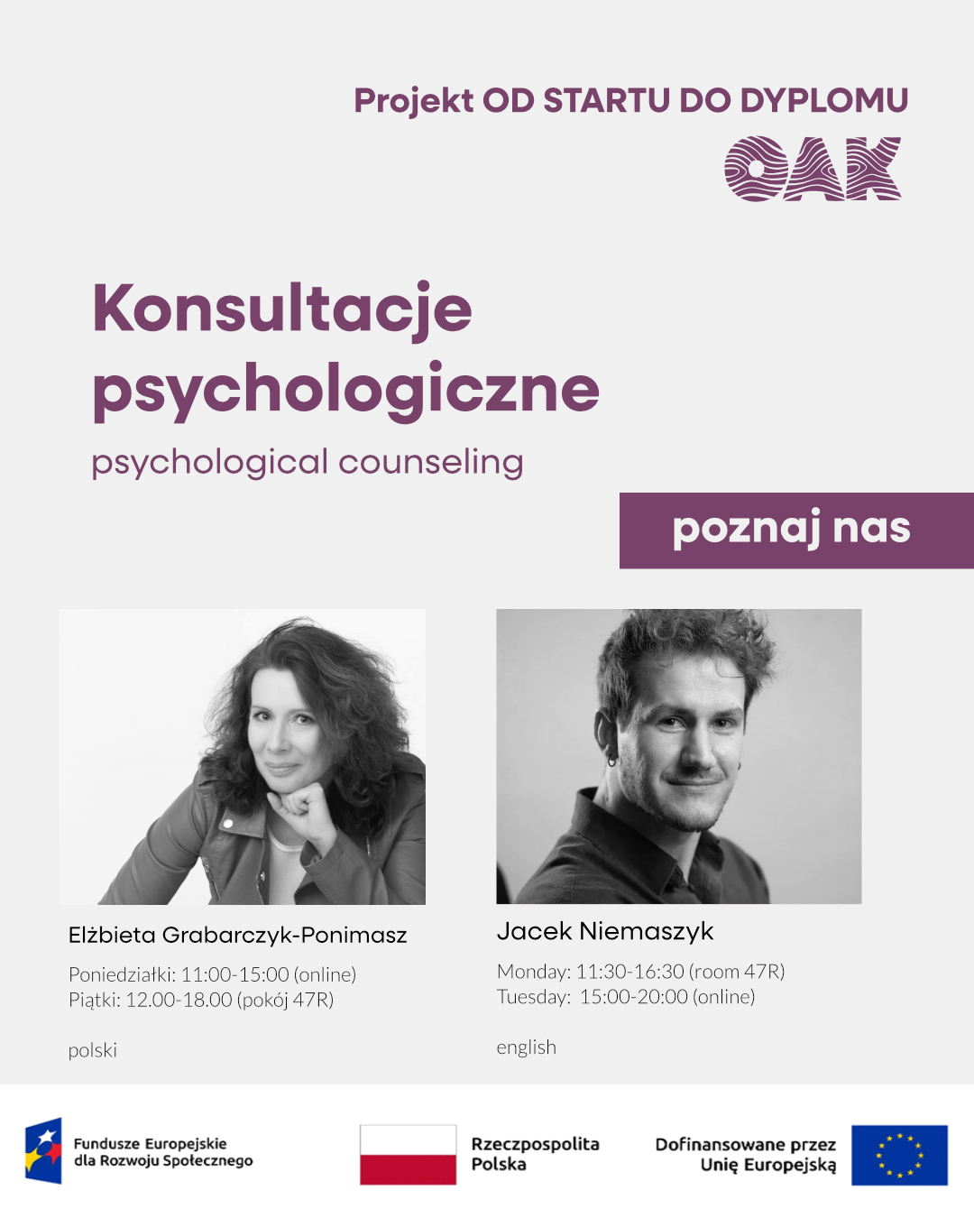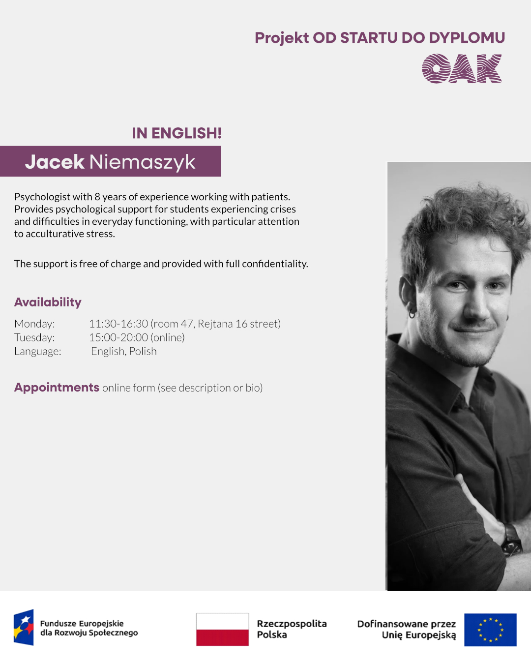 - Mondays: 11:30 – 16:30 (ul. Rejtana 16, pok. 47)