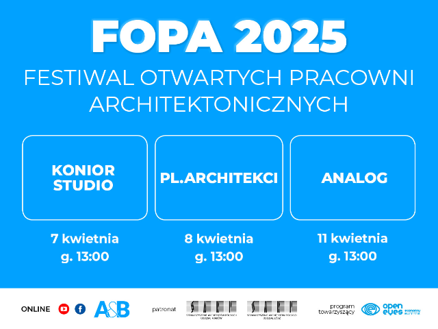 7.04.2025 rozpocznie się kolejna edycja Festiwalu Otwartych Pracowni Architektonicznych FOPA 2025, który jest wydarzeniem towarzyszącym Międzynarodowemu Kongresowi CYFROWA REGENERACJA MIAST organizowanemu w ramach OPEN EYES ECONOMY. Festiwal skierowany jest do architektów, projektantów, studentów architektury, ludzi zainteresowanych tematyką architektury. Podczas trzech dni Festiwalu wirtualnie odwiedzimy trzy pracownie architektoniczne — tym razem w Katowicach, Poznaniu i Szczecinie. Partnerem Wydarzenia jest SARP Kraków i SARP Łódź.
