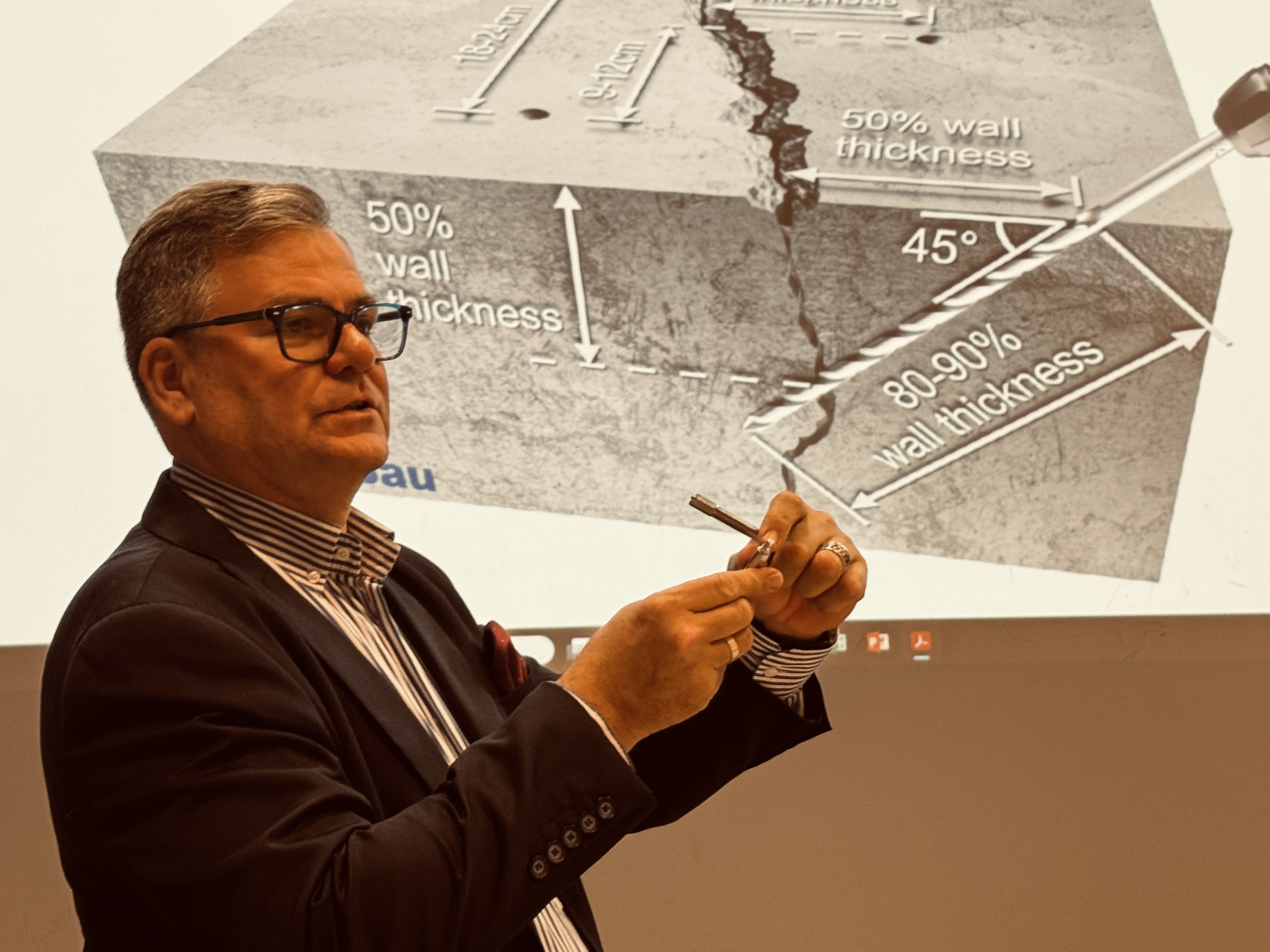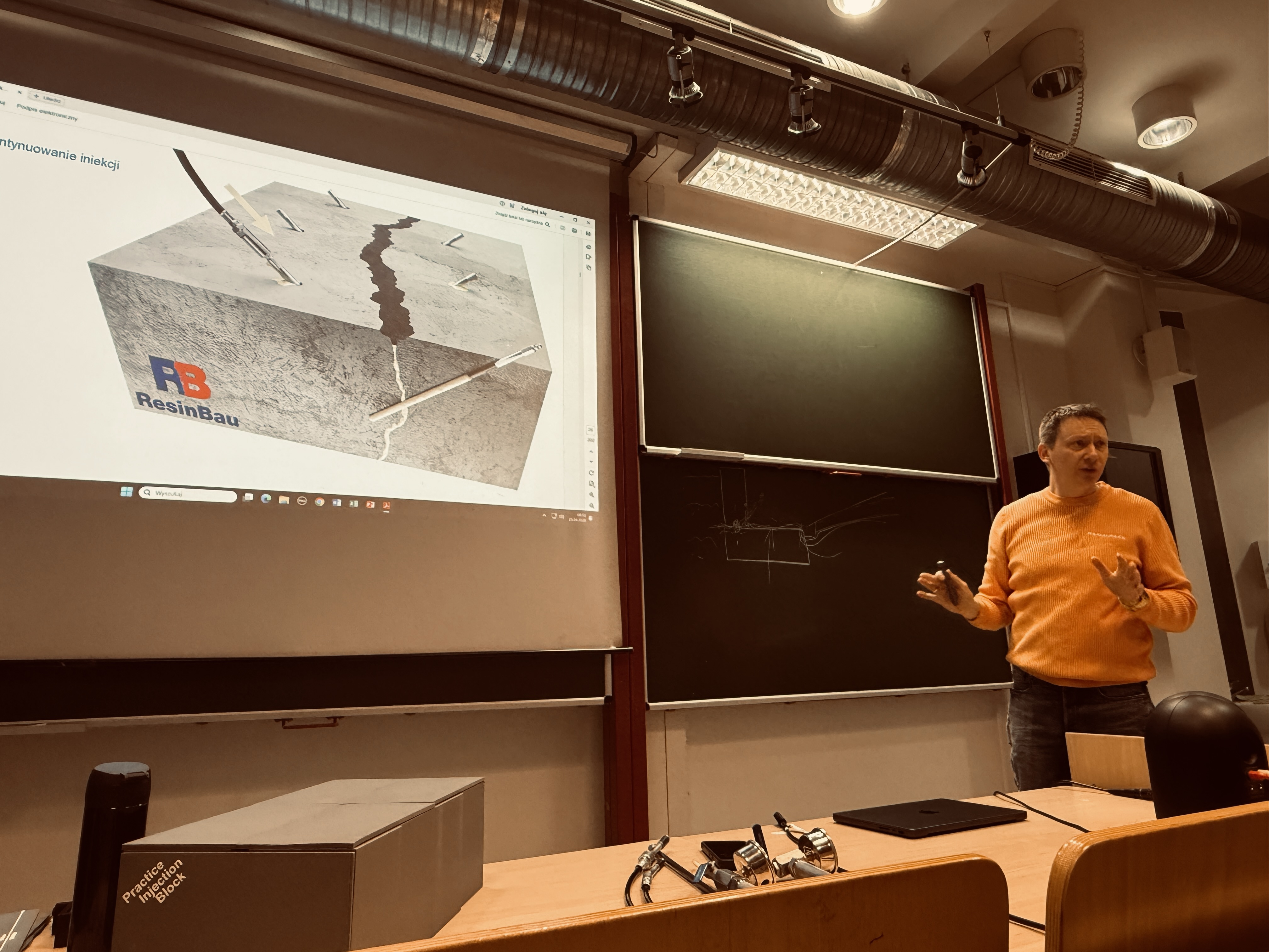 Spotkanie było okazją do poszerzenia wiedzy na temat iniekcji scalających i uszczelniających, technologii wykonywania prac iniekcyjnych, a także materiałów i sprzętu wykorzystywanych w tym obszarze. Nasz gość podzielił się ze studentami swoim doświadczeniem zawodowym oraz praktycznym spojrzeniem na zagadnienia związane z realizacją prac iniekcyjnych.