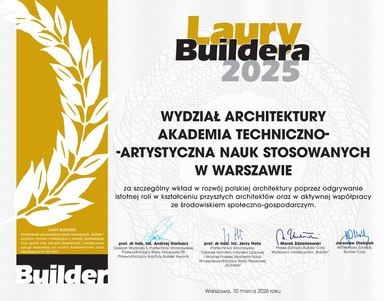 • Nagroda Laury Buildera 2025 dla Wydziału Architektury – za szczególny wkład w rozwój polskiej architektury poprzez odgrywanie istotnej roli w kształceniu przyszłych architektów oraz w aktywnej współpracy ze środowiskiem społeczno-gospodarczym.