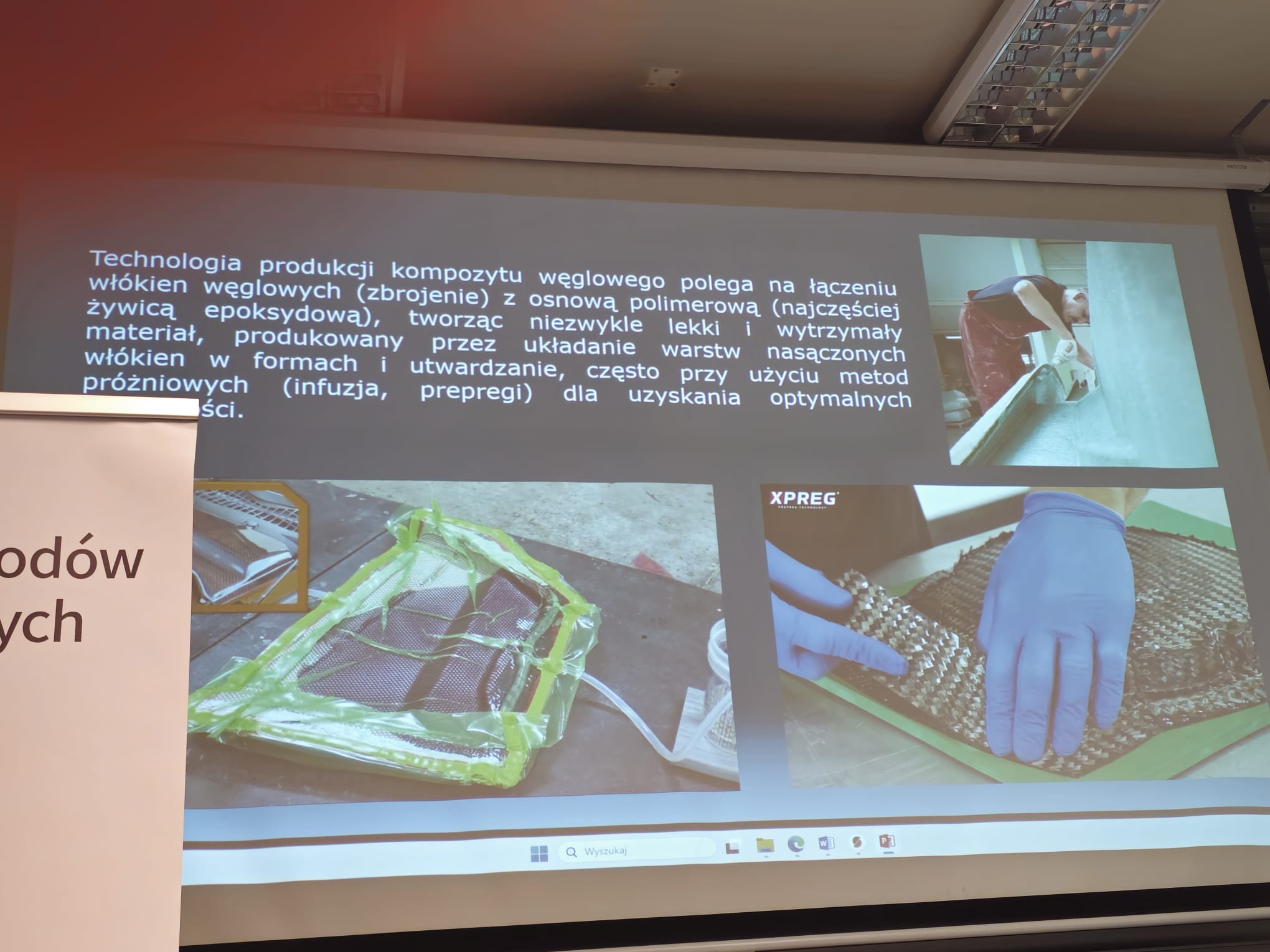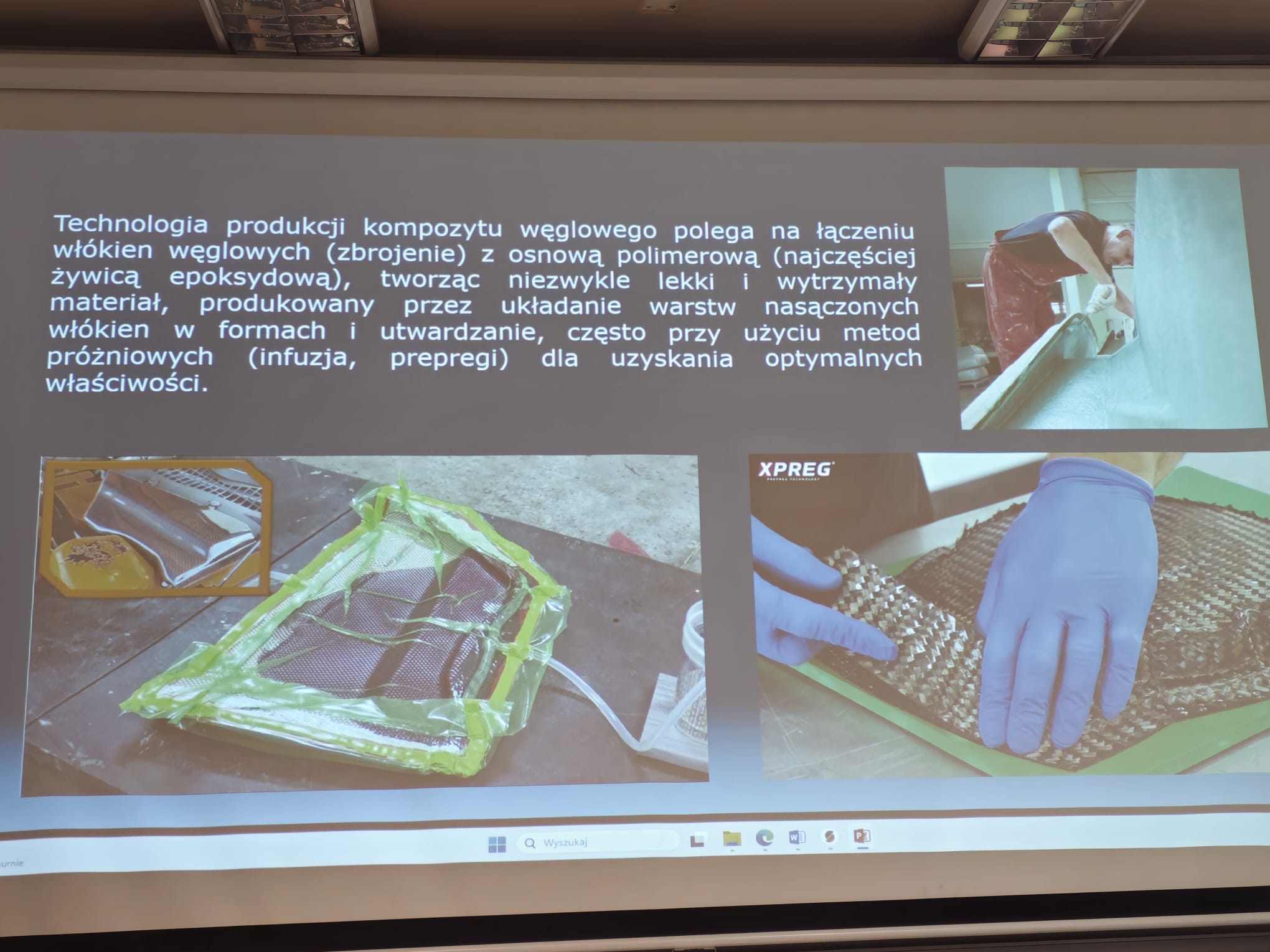 Tematem przewodnim drugiej części warsztatów była technologia wytwarzania elementów kompozytowych oraz struktur kompozytowych o sterowanej sztywności. Uczestnicy dowiedzieli się co to jest kompozyt, dlaczego z kompozytów buduje się nowoczesne samochody czy samoloty. Prowadzący opowiedzieli o historii materiałów kompozytowych. Przedstawili technologie wykonania elementów z materiałów kompozytowych: laminowanie ręczne, metoda worka próżniowego, infuzja żywicy, RTM oraz prepregi. Prowadzący opowiedzieli o materiałach stosowanych do produkcji struktur kompozytowych, praktycznych sposobach badania materiałów kompozytowych oraz ciekawostki związane zaawansowanymi materiałami kompozytowymi. Prowadzący zapoznali uczestników w podstawowymi terminami związanymi z materiałami kompozytowymi, takimi jak: włókno węglowe, kevlar, żywica epoksydowa, temperatura zeszklenia. Podczas warsztatów zaprezentowano rzeczywiste modele wykonane tymi technologiami oraz ich projekty. Podczas prezentacji zaprezentowano również „materiały inteligentne” przy pomocy których można sterować sztywnością struktur kompozytowych. Do takich materiałów należy Nitinol – metal z grupy materiałów SMA (Shape Memory Alloy).