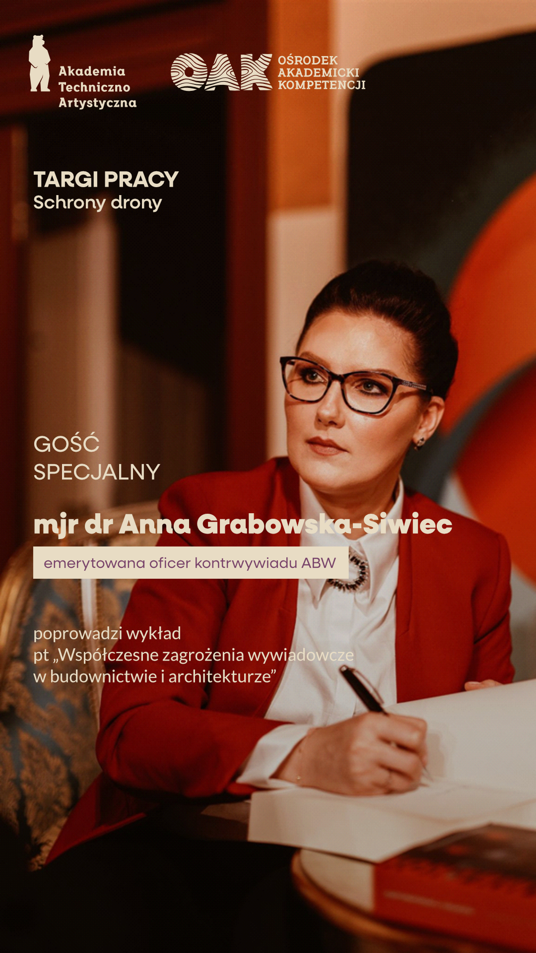 Podczas Targów Pracy i Technologii „SCHRONY DRONY” serdecznie zapraszamy na unikalny wykład Pani mjr dr Anny Grabowskiej-Siwiec, emerytowanej oficer kontrwywiadu ABW, pt.