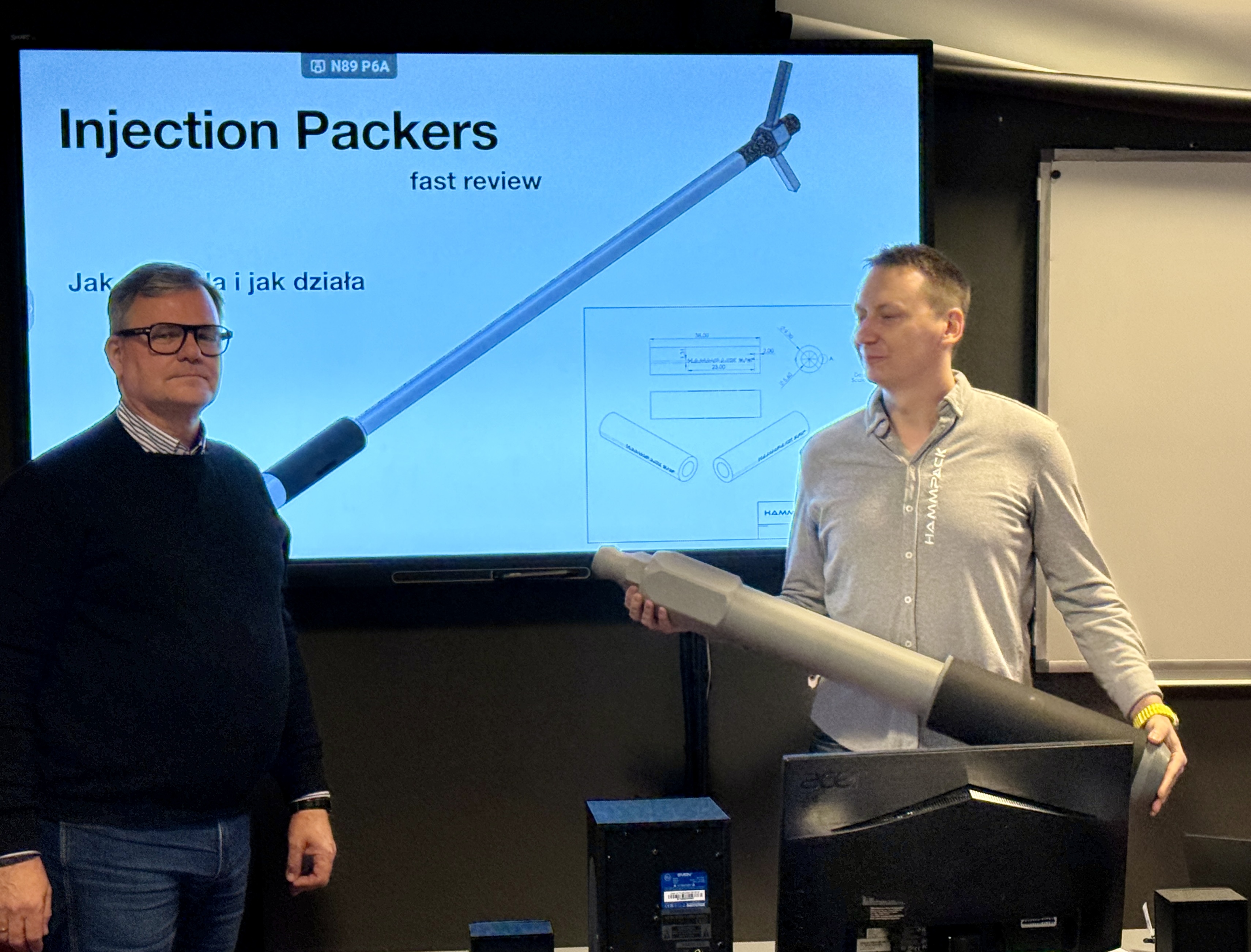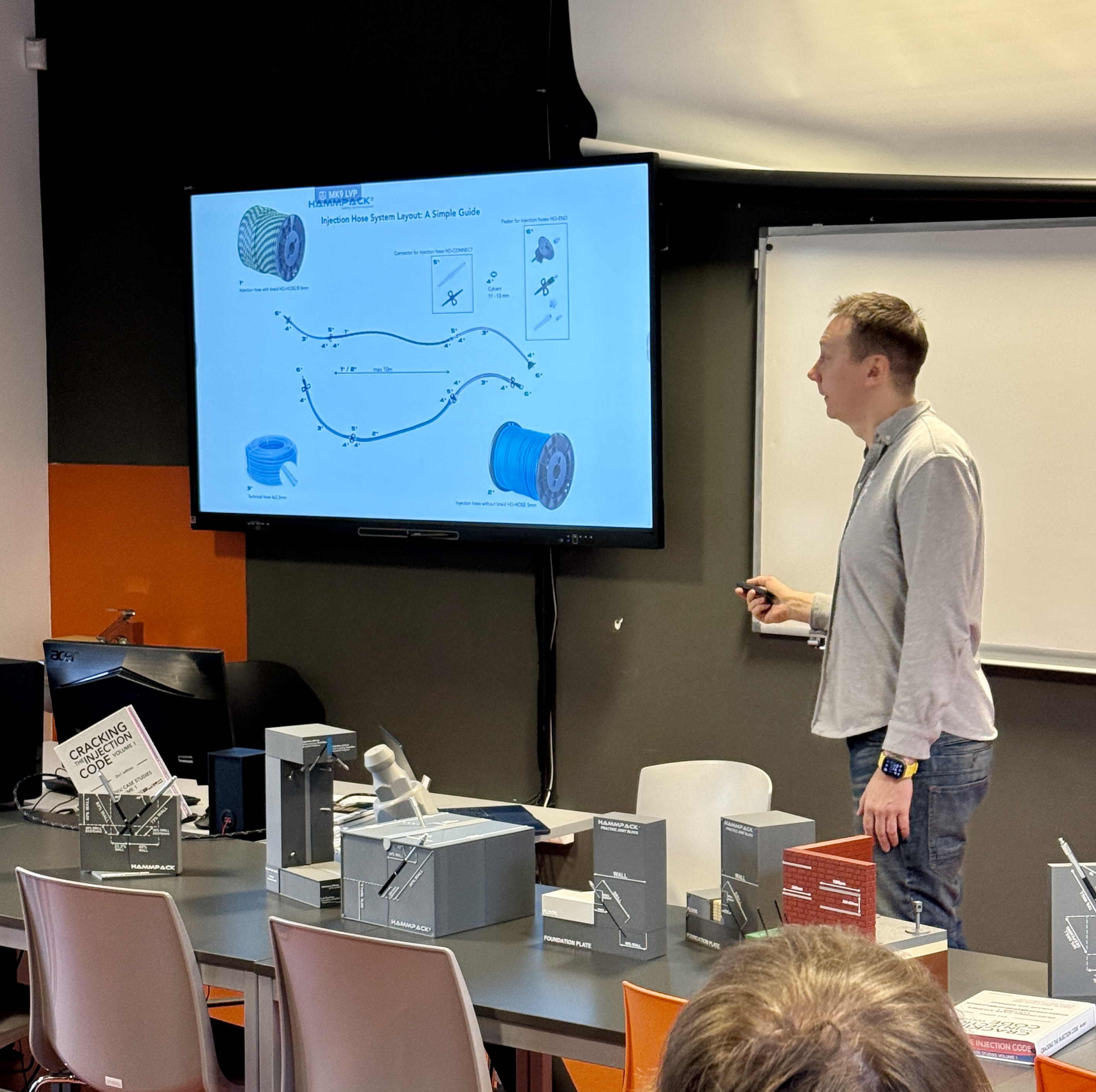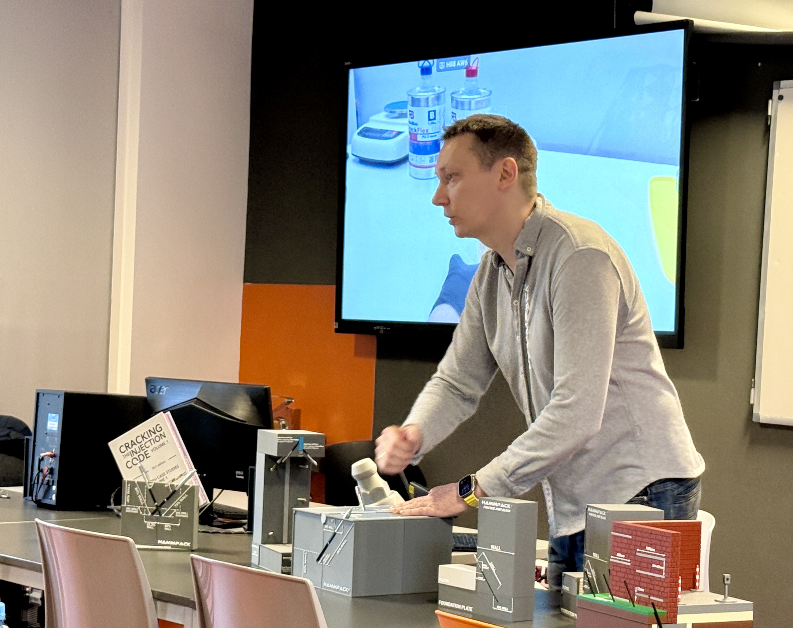 Podczas wykładu omówione zostały kluczowe techniki wykonywania iniekcji, a także zaprezentowano specjalistyczny osprzęt wykorzystywany przy pracach iniekcyjnych. Pan Łukasz przedstawił szerokie spektrum materiałów stosowanych w iniekcjach uszczelniających oraz wzmacniających, takich jak: