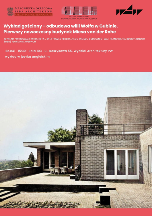 W imieniu OW SARP wraz z Mazowiecką Okręgową Izbą Architektów oraz Wydziałem Architektury Politechniki Warszawskiej zapraszamy na wykład gościnny – odbudowa willi Wolfa w Gubinie. Pierwszy nowoczesny budynek Miesa van der Rohe. Wykład poprowadzi (w języku angielskim) emerytowany urbanista niemiecki Pan Florian Mausbach.